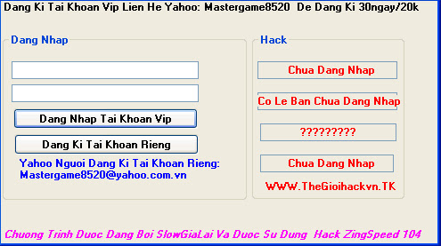 ########################################################################### THÔNG TIN BẢN CẬP NHẬT 1.8 CÓ GÌ MỚI NEW : Cập nhật zing speed hack loại 2 : tăng tốc độ mọi thứ trong game, tăng tốc độ quay may mắn và nhận biết kết quả, và tăng thời gian hoàn thành ở trận đấu ( Loại 2 chỉ dành cho máy có cấu hình mạnh ) 1 : TĂNG 10% TỐC ĐỘ HACK ZING SPEED VÀ GIẢM LAG SO VỚI PHIÊN BẢN Trước 2 : BẠN CÓ QUYỀN ĐÁNH GIẤU VÀO CHỨC NĂNG HACK SPEED BẤT CỨ LÚC NÀO MÀ BẠN MUỐN, KHÔNG YÊU CẦU PHẢI ĐỢI ĐẾM 3 2 1 3 : KHI MUỐN SỬ DỤNG BẠN CHỈ VIỆC ĐĂNG NHẬP HACK XONG VÀO GAME VÀ ĐÁNH GIẤU VÀO CHỨC NĂNG SPEED HACK, TIẾP THEO CHỌN TỐC ĐỘ MUỐN HACK. KHI NÀO MUỐN TẠM DỪNG HACK SPEED THÌ BÕ GIẤU VỀ CHỨC NĂNG HACK ĐIỂM 4K THÌ VẪN SỬ DỤNG NHƯ PHIÊN BẢN TRƯỚC. BAN QUẢN TRỊ Z-SPEED TOOL SẼ CÓ CÁCH ÁP DỤNG CHO TOOL NGÀY CÀNG PHÁT TRIỂN PRO HƠN, CẢM ƠN CÁC BẠN ĐÃ QUAN TÂM VÀ ỦNG HỘ. NẾU KHI SỬ DỤNG CHƯƠNG TRÌNH BẠN GẶP LỖI XIN HÃY BÁO VỚI BQT QUA YAHOO : MASTERGAME8520@YAHOO.COM.VN VÁ BÁO LỖI ########################################################################### DOWNLOAD HACK ZING SPEED PHIÊN BẢN 1.8 Mọi windows Link down 1.8 : NHẤN VÀO ĐÂY ĐỂ TẢI VỀ